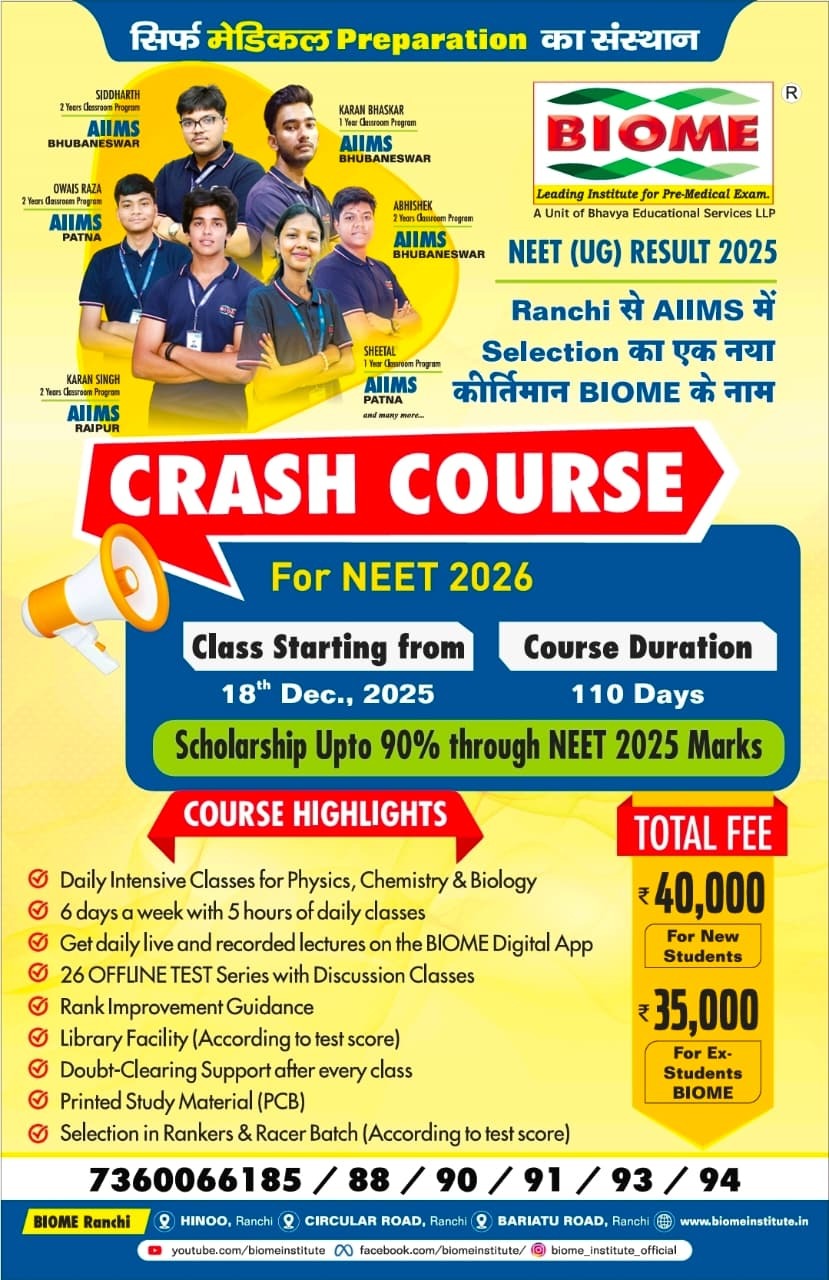 Ranchi Student will again outperform in NEET - 2017, But BIOME INSTITUTE would hold the flag.